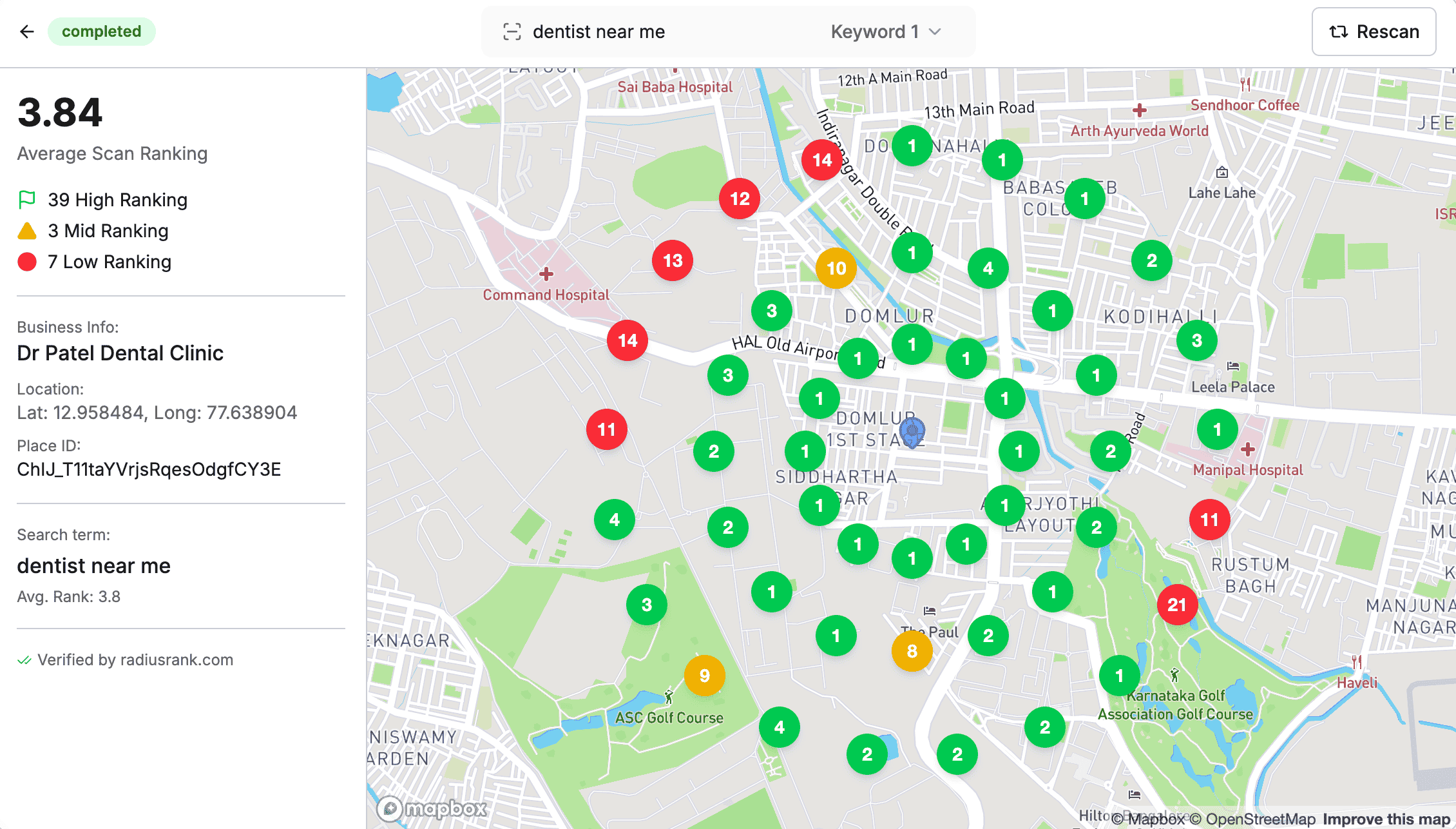 RadiusRank offers a "bird's-eye view of local search rankings" with its geo-grid map format and provides unique AI analysis with recommendations for improving your local search performance.